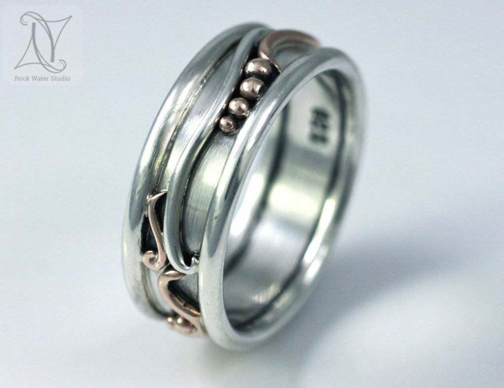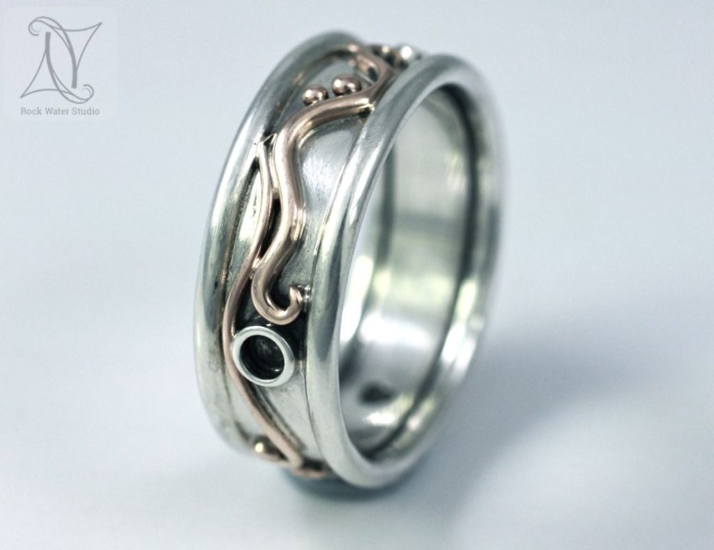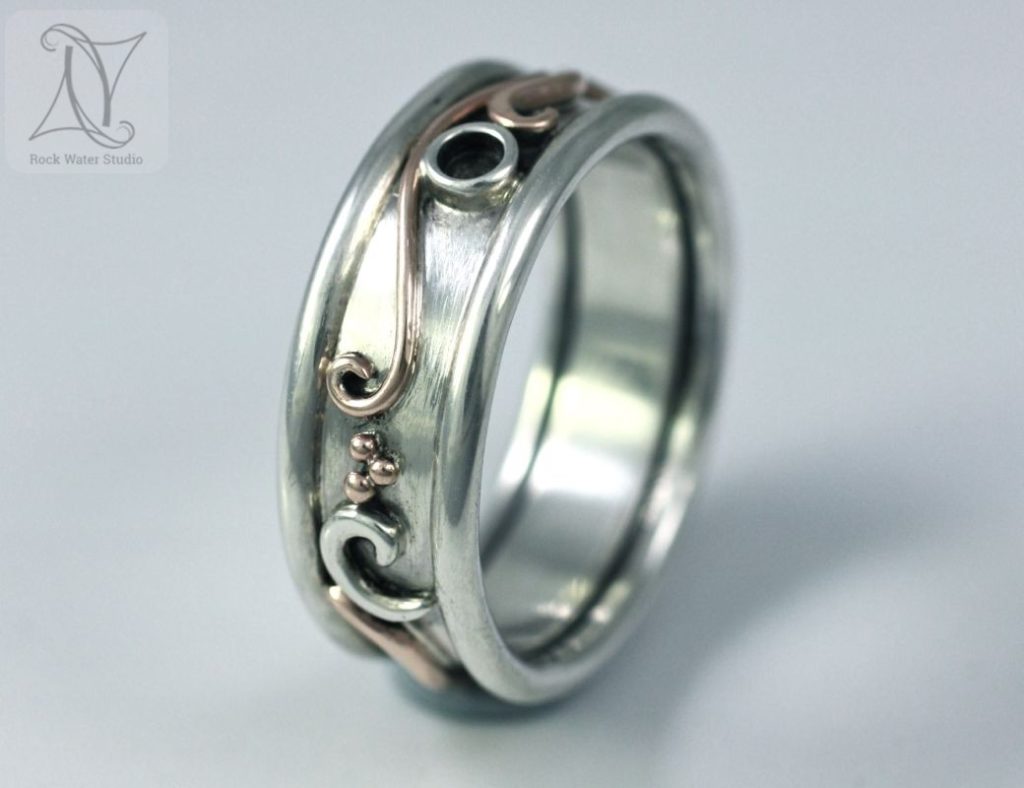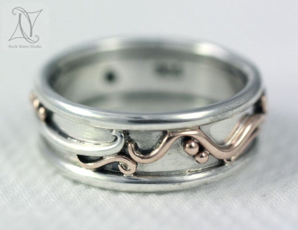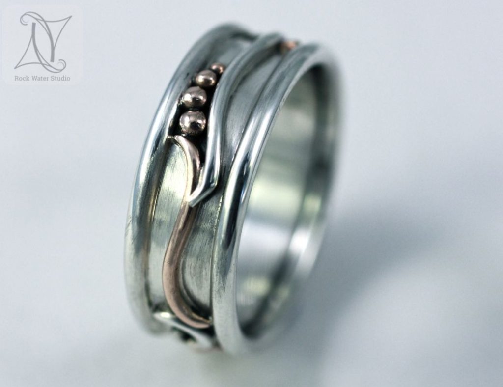 A wedding ring created in a unique combination of silver and 9k rose gold, custom made to incorporate elements of the botanical world.
