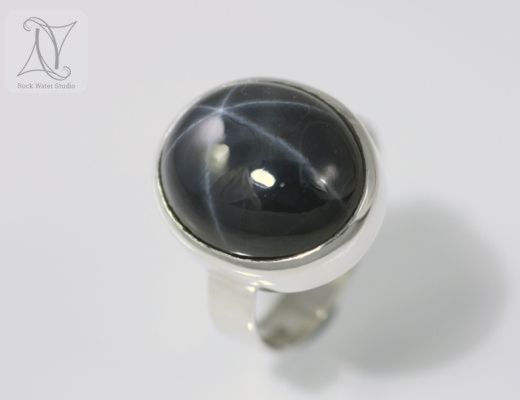 Star Sapphire set in 9K white gold. A simple setting for a magnificent Star Sapphire. The six ray star, or asterism, appears to float beneath the surface of the stone and move with the light source.
