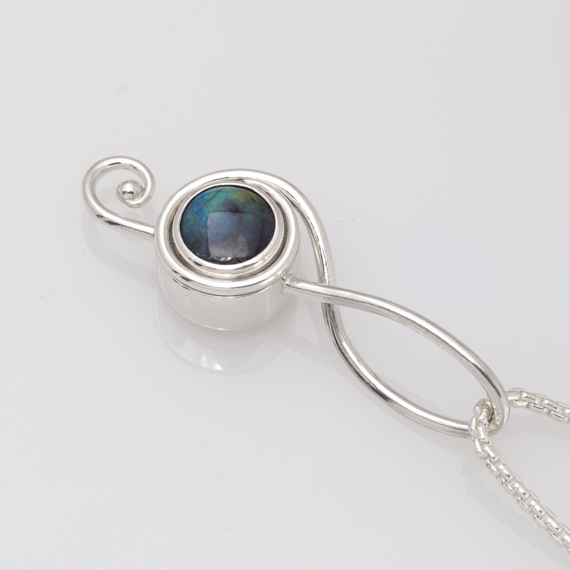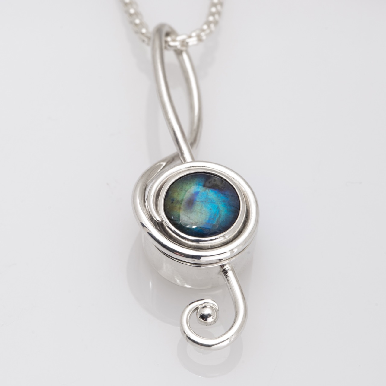 A single line curves and flows like music in motion, holding a compass at its heart. Sterling silver traces the shape of a treble clef, while labradorite glows with shifting blues and greens – a quiet reminder that direction in life is not always straight, but deeply personal. Created as a wearable compass for an eighteenth birthday, this piece honours the moment when instinct, creativity, and courage begin to lead the way.