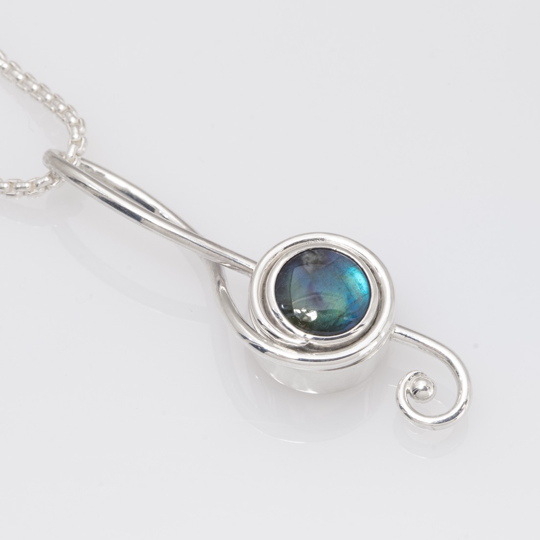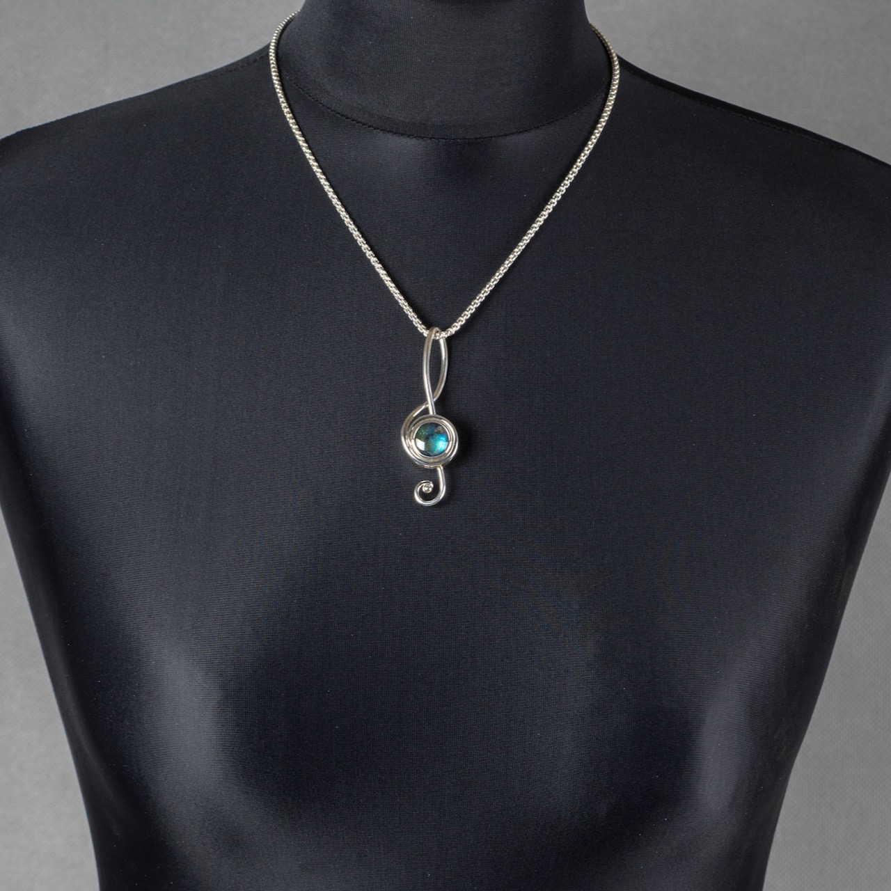 The pendant was handcrafted in sterling silver, with the flowing line of the treble clef formed by hand to maintain softness and balance. At its heart sits a waterproof working compass, which you can see when the pendant is turned over. A luminous labradorite was chosen for its depth and movement. One of my favourite gemstones.